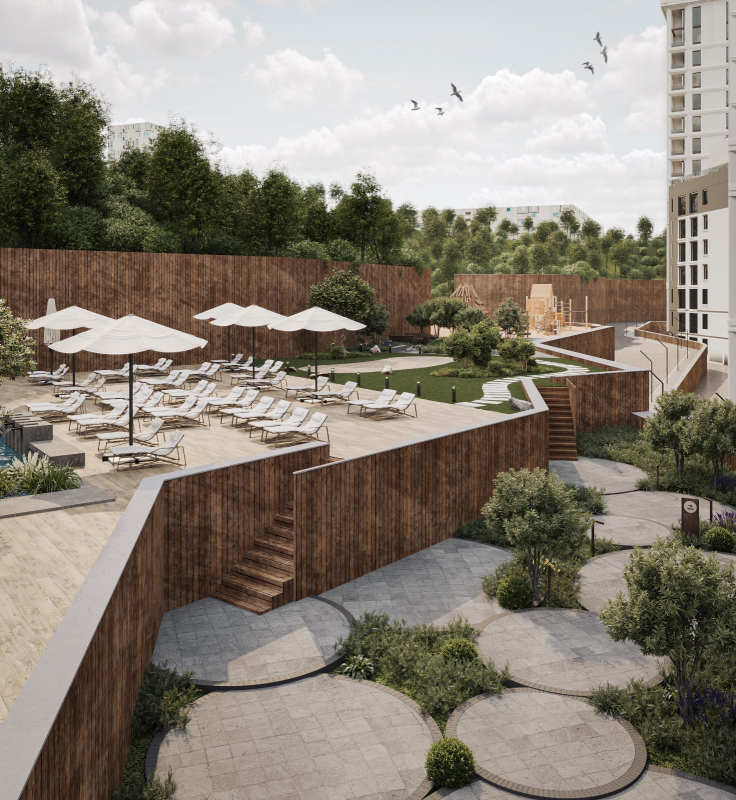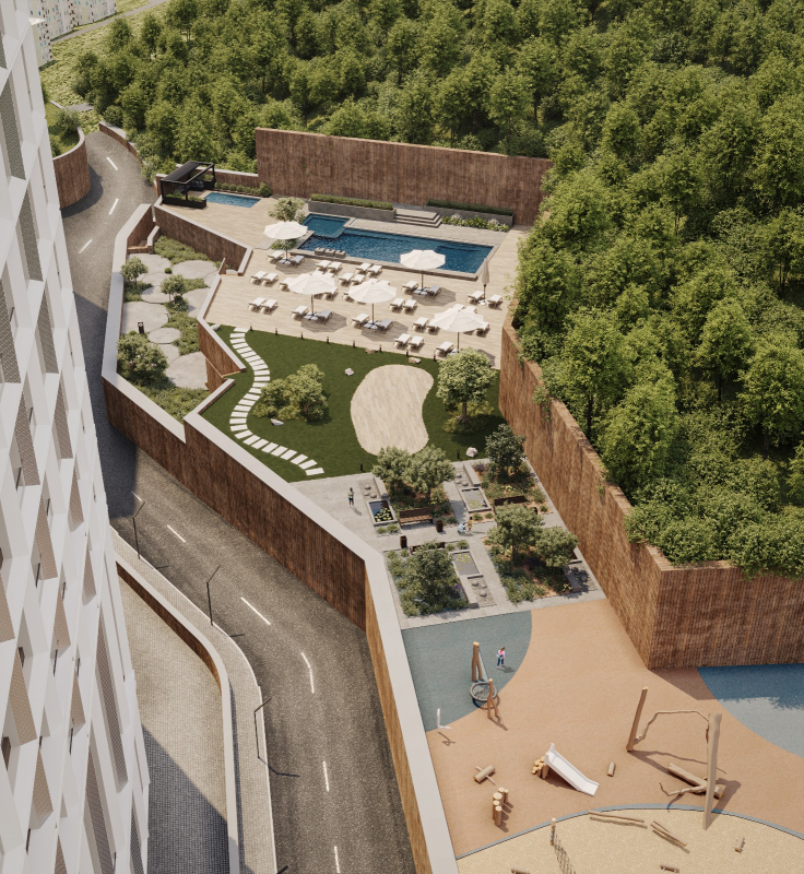 На территории комплекса предусмотрены зоны отдыха, благоустройство и коммерческая инфраструктура.
